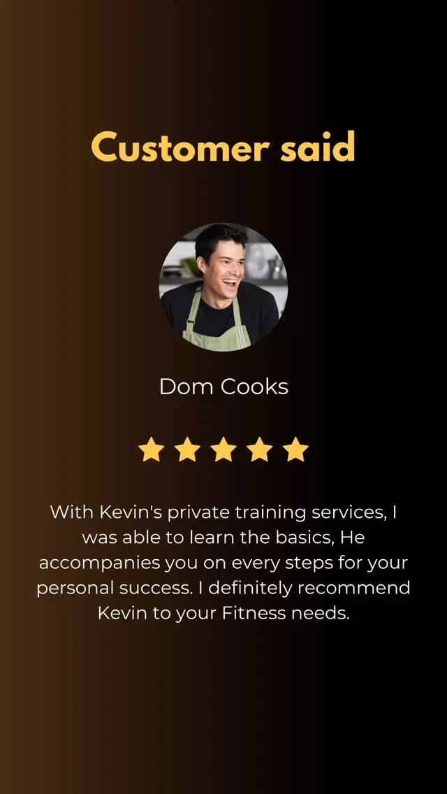 “With Kevin's private training services, I was able to learn the basics, He accompanies you on every steps for your personal success. I definitely recommend Kevin to your Fitness needs."