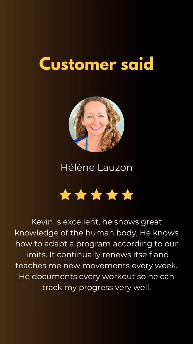 “Kevin is excellent, he shows great knowledge of the human body, He knows how to adapt a program according to our limits. It continually renews itself and teaches me new movements every week. He documents every workout so he can track my progress very well.”