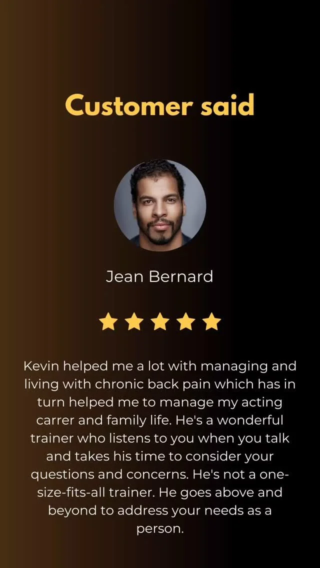 “Kevin helped me a lot with managing and living with chronic back pain which has in turn helped me to manage my acting carrer and family life. He's a wonderful trainer who listens to you when you talk and takes his time to consider your questions and concerns. He's not a one-size-fits-all trainer. He goes above and beyond to address your needs as a person.”