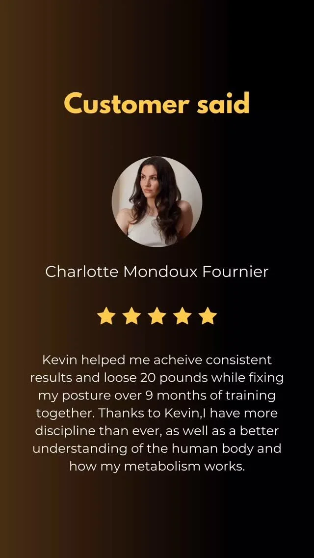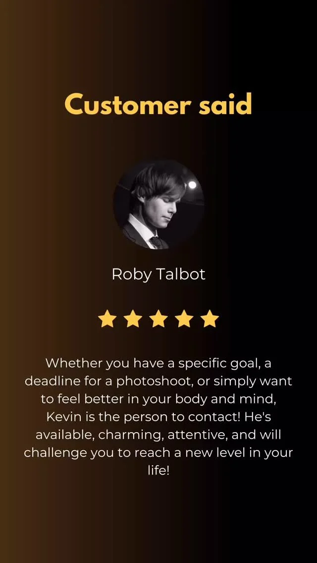 “Whether you have a specific goal, a deadline for a photoshoot, or simply want to feel better in your body and mind, Kevin is the person to contact! He's available, charming, attentive, and will challenge you to reach a new level in your life!”