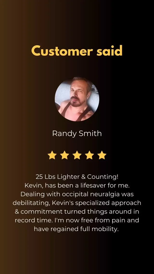 “25 Lbs Lighter & Counting! Kevin, has been a lifesaver for me. Dealing with occipital neuralgia was debilitating, Kevin's specialized approach & commitment turned things around in record time. I'm now free from pain and have regained full mobility.”