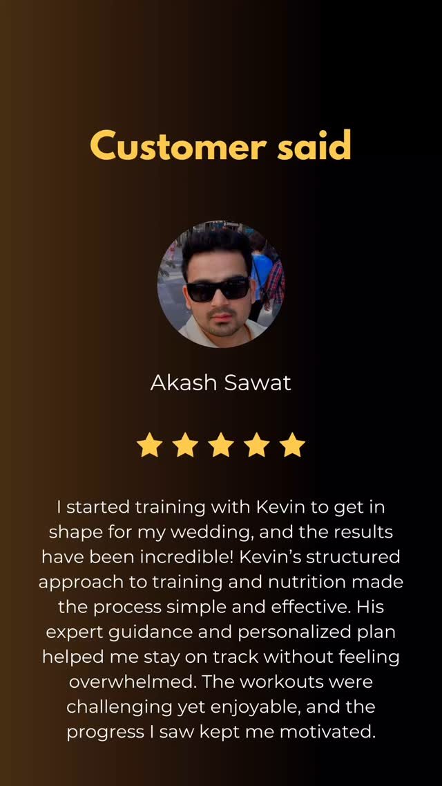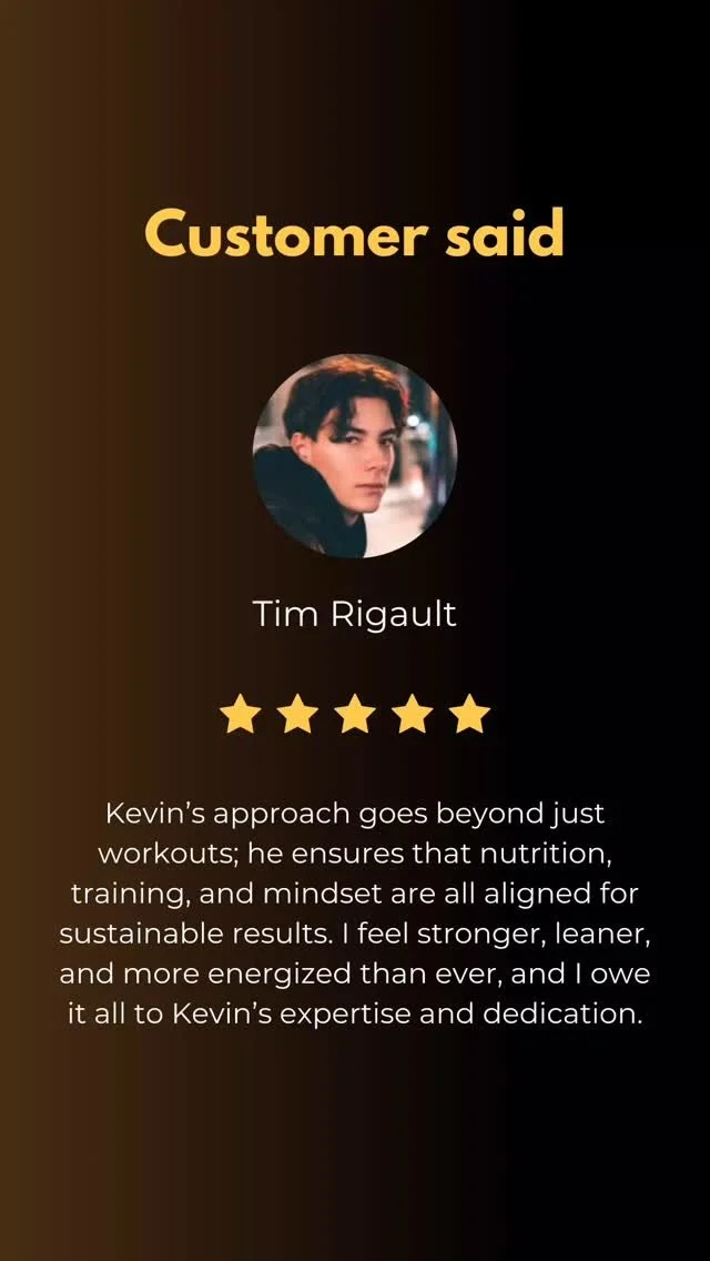 “Kevin’s approach goes beyond just workouts; he ensures that nutrition, training, and mindset are all aligned for sustainable results. I feel stronger, leaner, and more energized than ever, and I owe it all to Kevin’s expertise and dedication.”