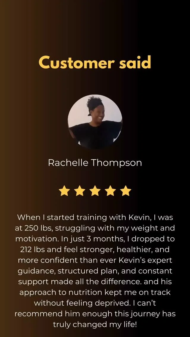 “When I started training with Kevin, I was at 250 lbs, struggling with my weight and motivation. In just 3 months, I dropped to 212 lbs and feel stronger, healthier, and more confident than ever Kevin’s expert guidance, structured plan, and constant support made all the difference. and his approach to nutrition kept me on track without feeling deprived. I can’t recommend him enough this journey has truly changed my life!”