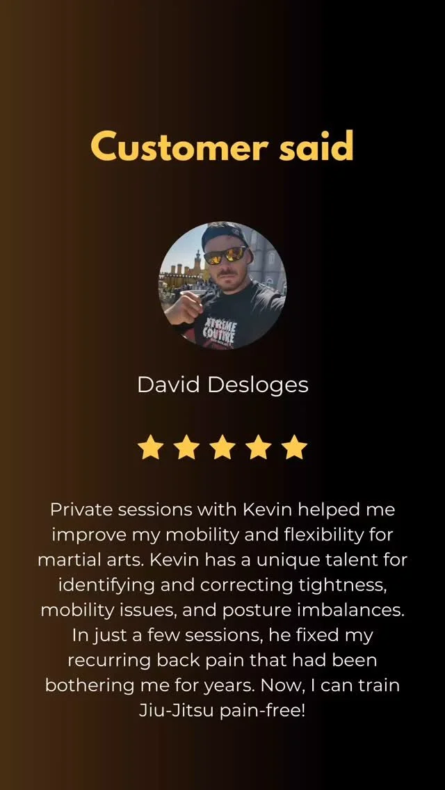 “Private sessions with Kevin helped me improve my mobility and flexibility for martial arts. Kevin has a unique talent for identifying and correcting tightness, mobility issues, and posture imbalances. In just a few sessions, he fixed my recurring back pain that had been bothering me for years. Now, I can train Jiu-Jitsu pain-free!”
