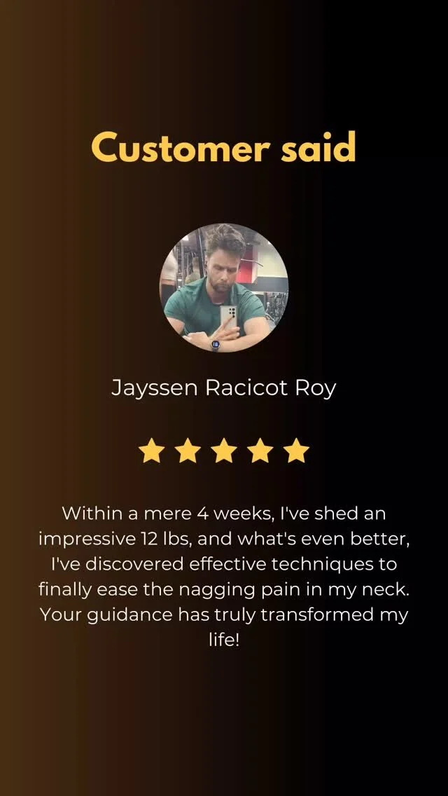 “Within a mere 4 weeks, I've shed an impressive 12 lbs, and what's even better, I've discovered effective techniques to finally ease the nagging pain in my neck. Your guidance has truly transformed my life!”