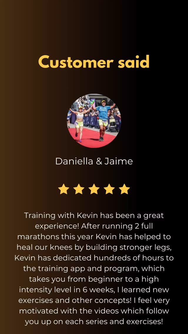 “Training with Kevin has been a great experience! After running 2 full marathons this year Kevin has helped to heal our knees by building stronger legs, Kevin has dedicated hundreds of hours to the training app and program, which takes you from beginner to a high intensity level in 6 weeks, I learned new exercises and other concepts! I feel very motivated with the videos which follow you up on each series and exercises!”