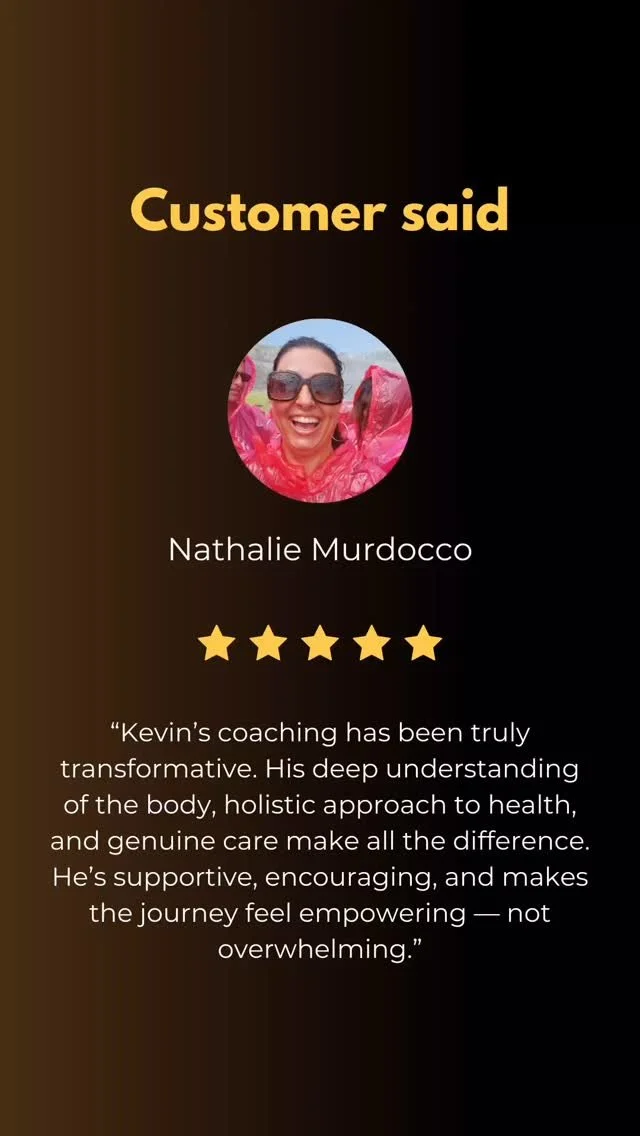 “Kevin’s coaching has been truly transformative. His deep understanding of the body, holistic approach to health, and genuine care make all the difference. He’s supportive, encouraging, and makes the journey feel empowering — not overwhelming.”
