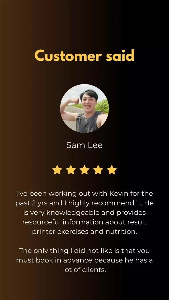 “I’ve been working out with Kevin for the past 2 yrs and I highly recommend it. He is very knowledgeable and provides resourceful information about result printer exercises and nutrition. The only thing I did not like is that you must book in advance because he has a lot of clients.”